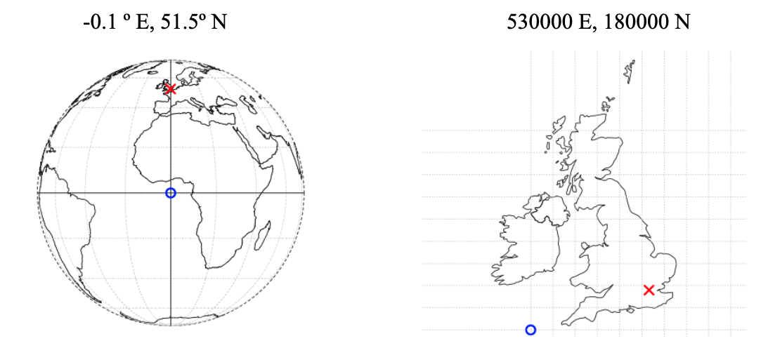 Ponto azul representa a origem do CRS e ponto vermelho a coordenada de localização de Londres.
